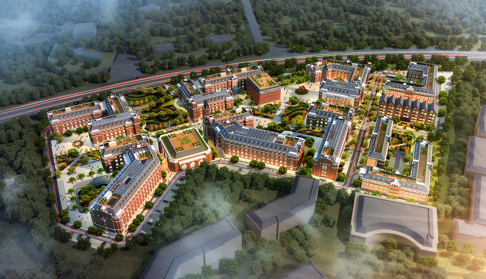 本項目位于中德生態(tài)園東側(cè),東側(cè)、南側(cè)與九中相鄰,在設(shè)計時充分考慮周邊建筑現(xiàn)狀,采用紅磚灰頂?shù)挠⑹斤L(fēng)格作為建筑立面。紅瓦灰頂,相互借勢,打造中德門戶建筑。