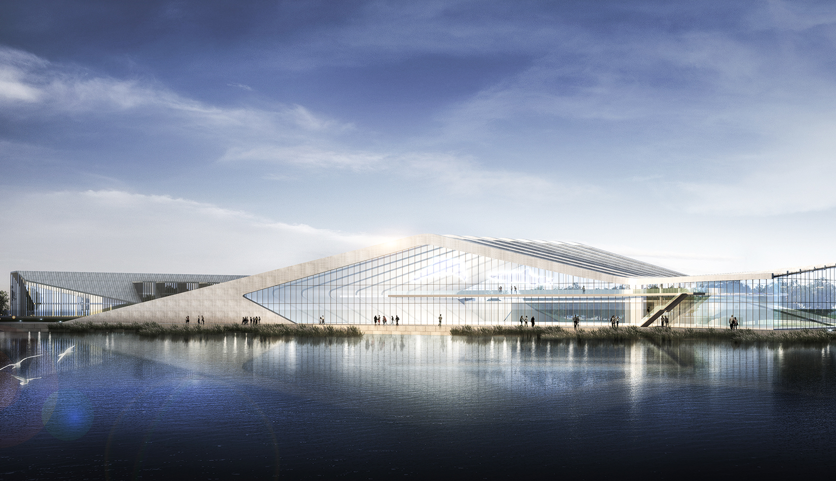 海洋科技館坐落在中科院青島科教園沿海區(qū)的中心地帶,沿海岸線呈一字型布局。方案設(shè)計(jì)以浪花和貝殼為意象,建筑像從場(chǎng)地中生長(zhǎng)出來,擁有著與海浪一樣流暢的外形,在與基址和諧相融的同時(shí),也呼應(yīng)著青島的城市文化和人文關(guān)系。大跨度鋼結(jié)構(gòu)結(jié)構(gòu)排架為大空間的開放展示提供了可能,同時(shí)營(yíng)造了無間斷的觀??臻g。科技館外墻以玻璃幕墻為主,保證了觀海景觀通透性。
