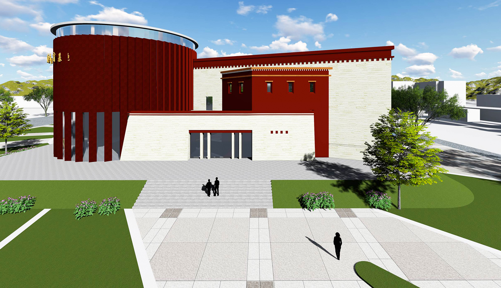 設(shè)計(jì)造型整體為中心聚攏的形態(tài),圓形體塊是建筑的核心,象征著黨的領(lǐng)導(dǎo),各分支體塊象征著分布在果洛的各個(gè)民族,體現(xiàn)出各民族團(tuán)結(jié)一心,同心向黨,在黨的領(lǐng)導(dǎo)下團(tuán)結(jié)一致、共同奮斗;另一方面,圓形體塊與各分支體塊的簇?fù)黻P(guān)系也象征著各民族緊密團(tuán)結(jié),永不分離。