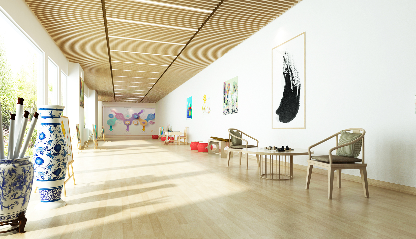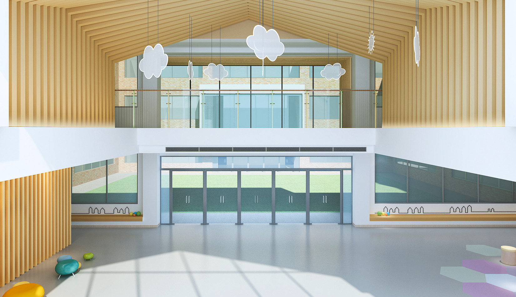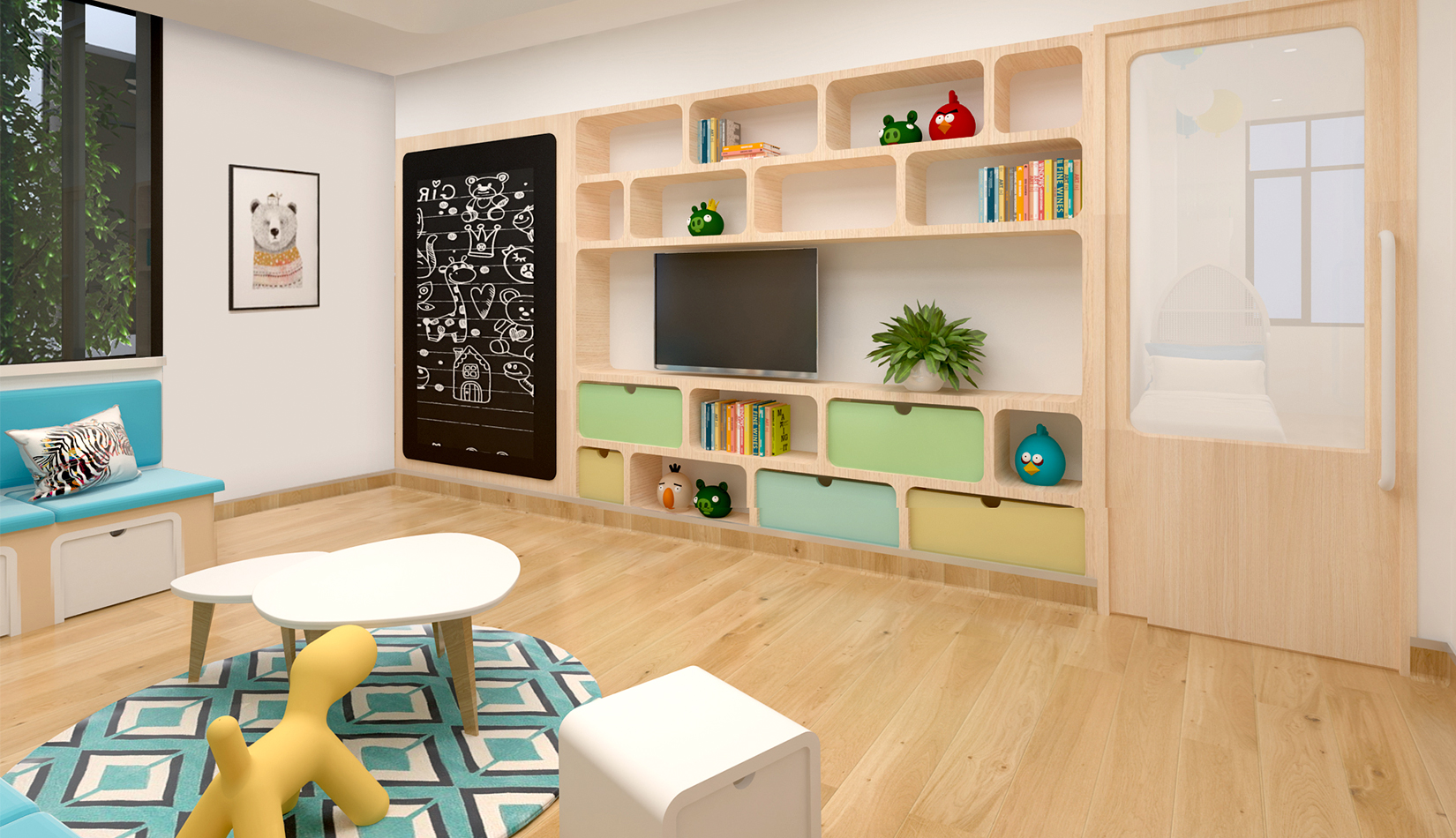 室內(nèi)延續(xù)建筑,空間內(nèi)部采光非常好。設(shè)計(jì)簡(jiǎn)潔、現(xiàn)代,以白色為主色調(diào),搭配淺木色作為室內(nèi)顏色?;顫?、好動(dòng)、天真、可愛(ài)是兒童最大的特點(diǎn),在其具體功能空間設(shè)計(jì)中,我們把這些特點(diǎn)和空間色彩結(jié)合起來(lái),不同的空間根據(jù)其使用功能,采用了不同的色彩搭配。