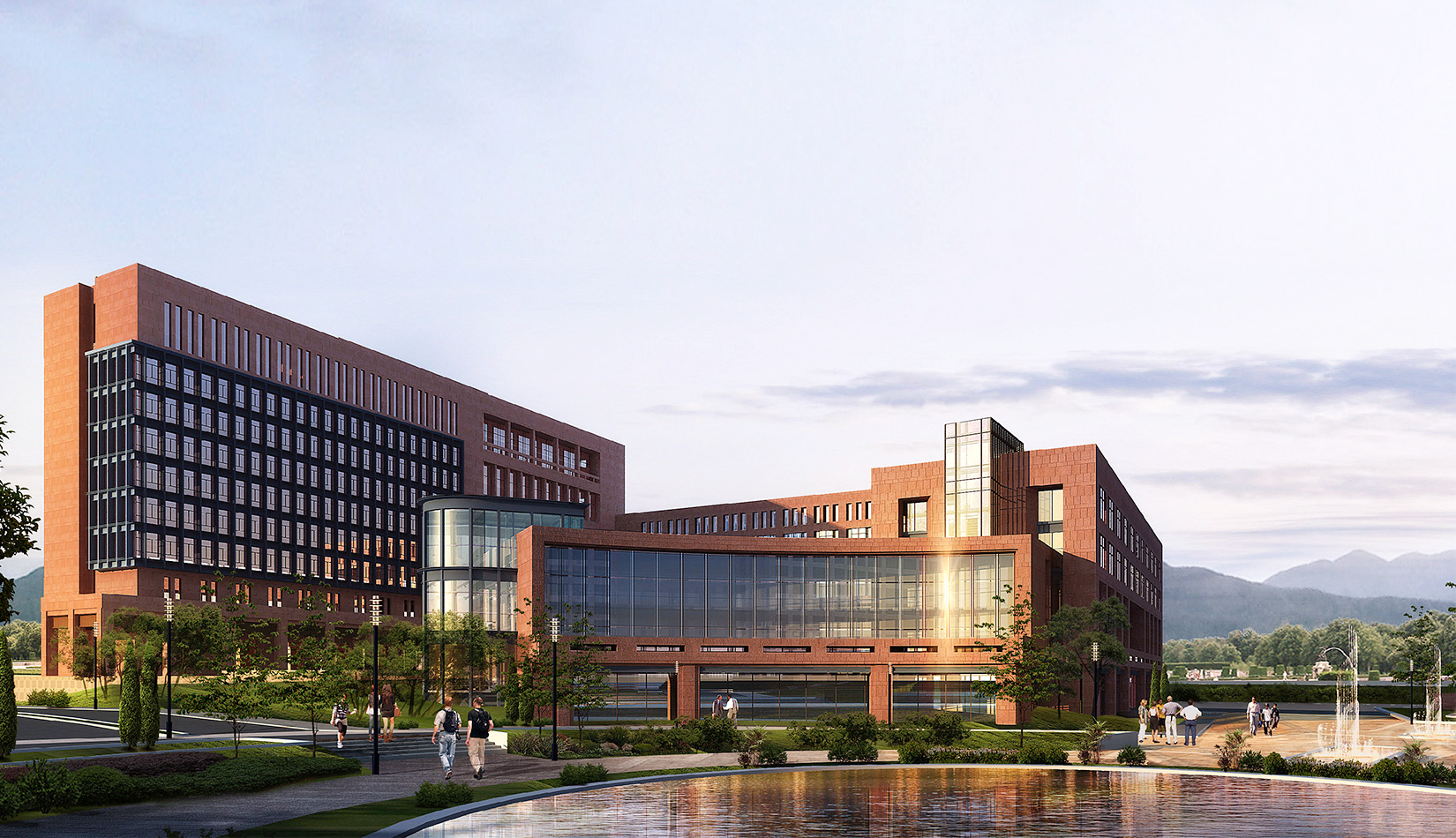 總體的規(guī)劃布局圍繞中心景觀廣場展開設計。首先從山區(qū)建筑布局師法自然,藏風聚氣的傳統(tǒng)觀念出發(fā),結合現(xiàn)代科學嚴謹求真務實的態(tài)度,設計以東側入口廣場導入的中心景觀空間圍合展開規(guī)劃布局,總體上根據(jù)土地的使用性質分為四個區(qū),分別是正對主入口北側的生活區(qū),南側的孵化中心區(qū),正對主入口廣場的科研辦公區(qū),以及整個用地最南端的產(chǎn)業(yè)開發(fā)區(qū),各個區(qū)既相互獨立同時又緊密聯(lián)系,功能上即考慮主導風向又方便使用。