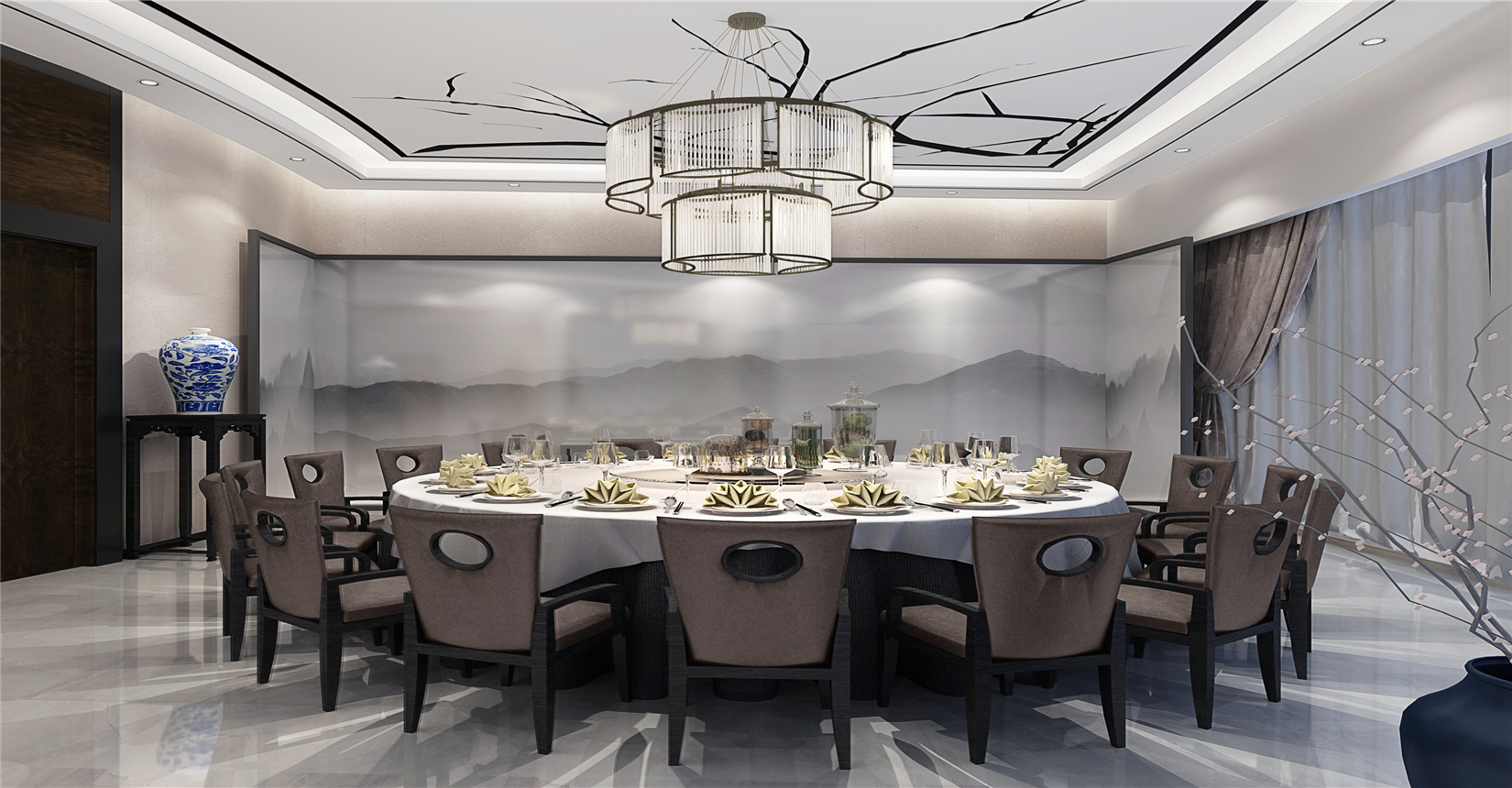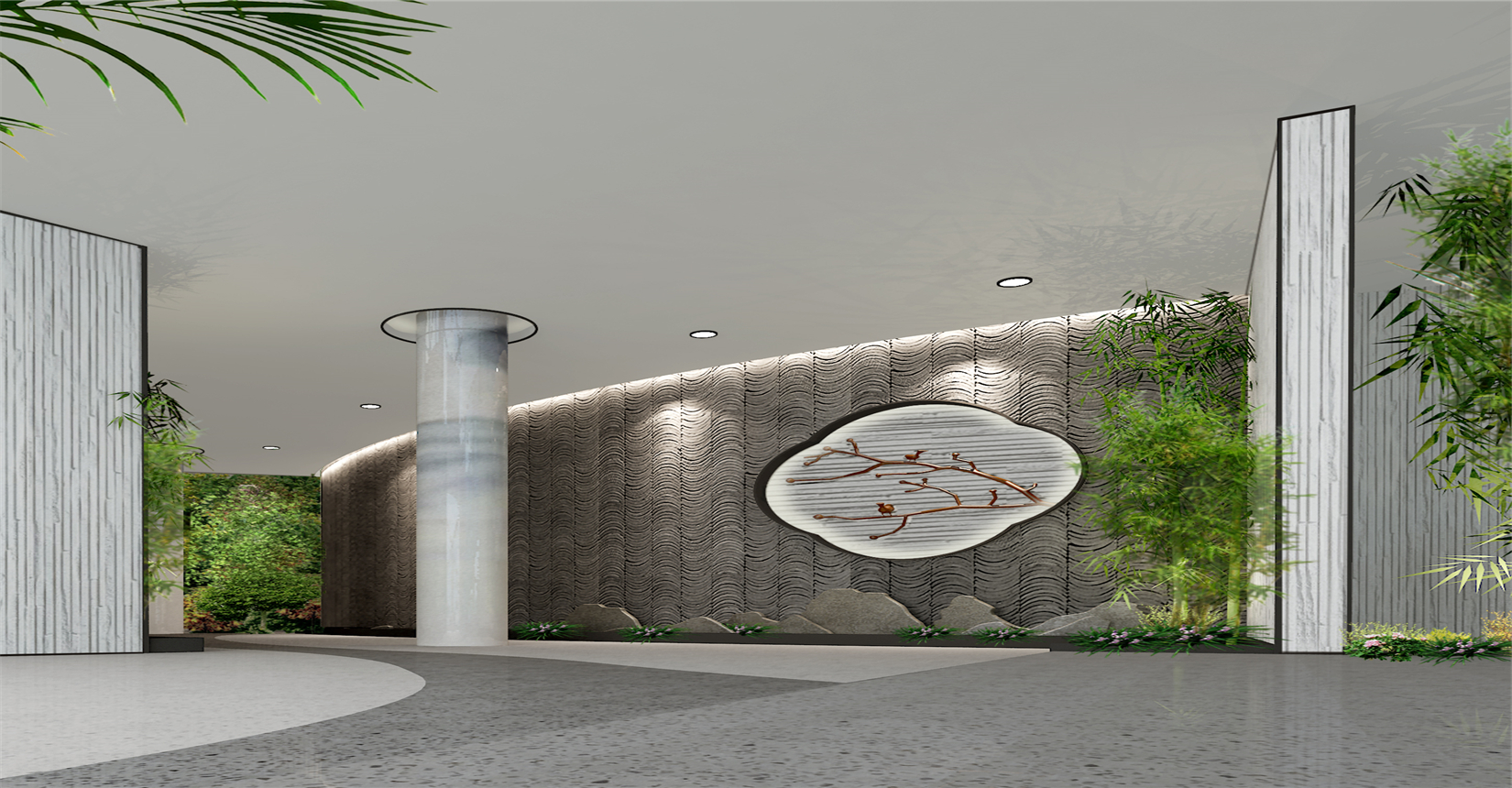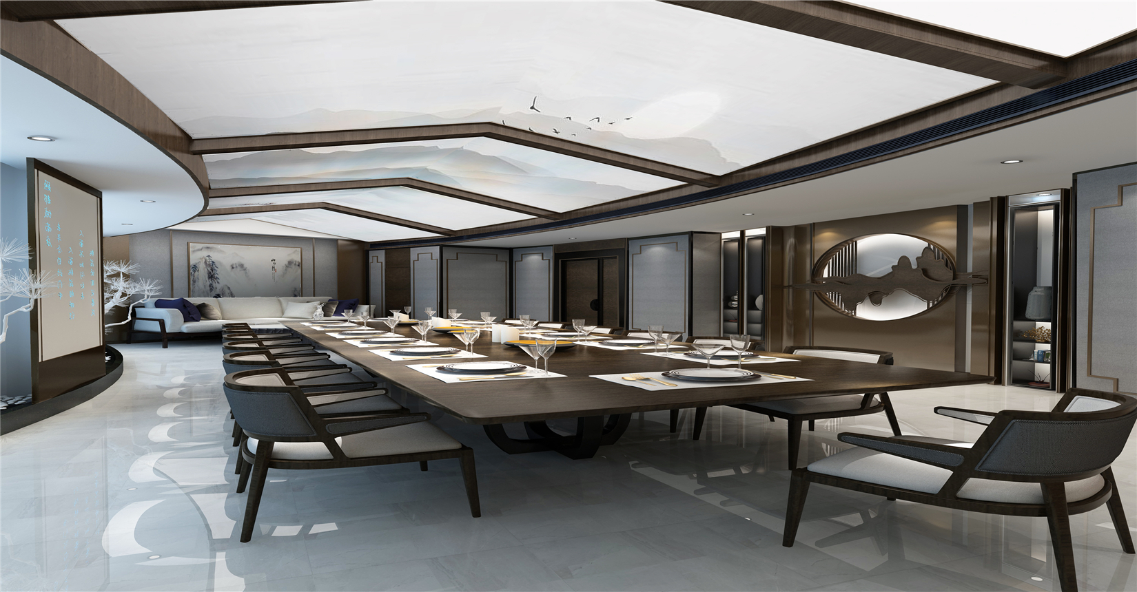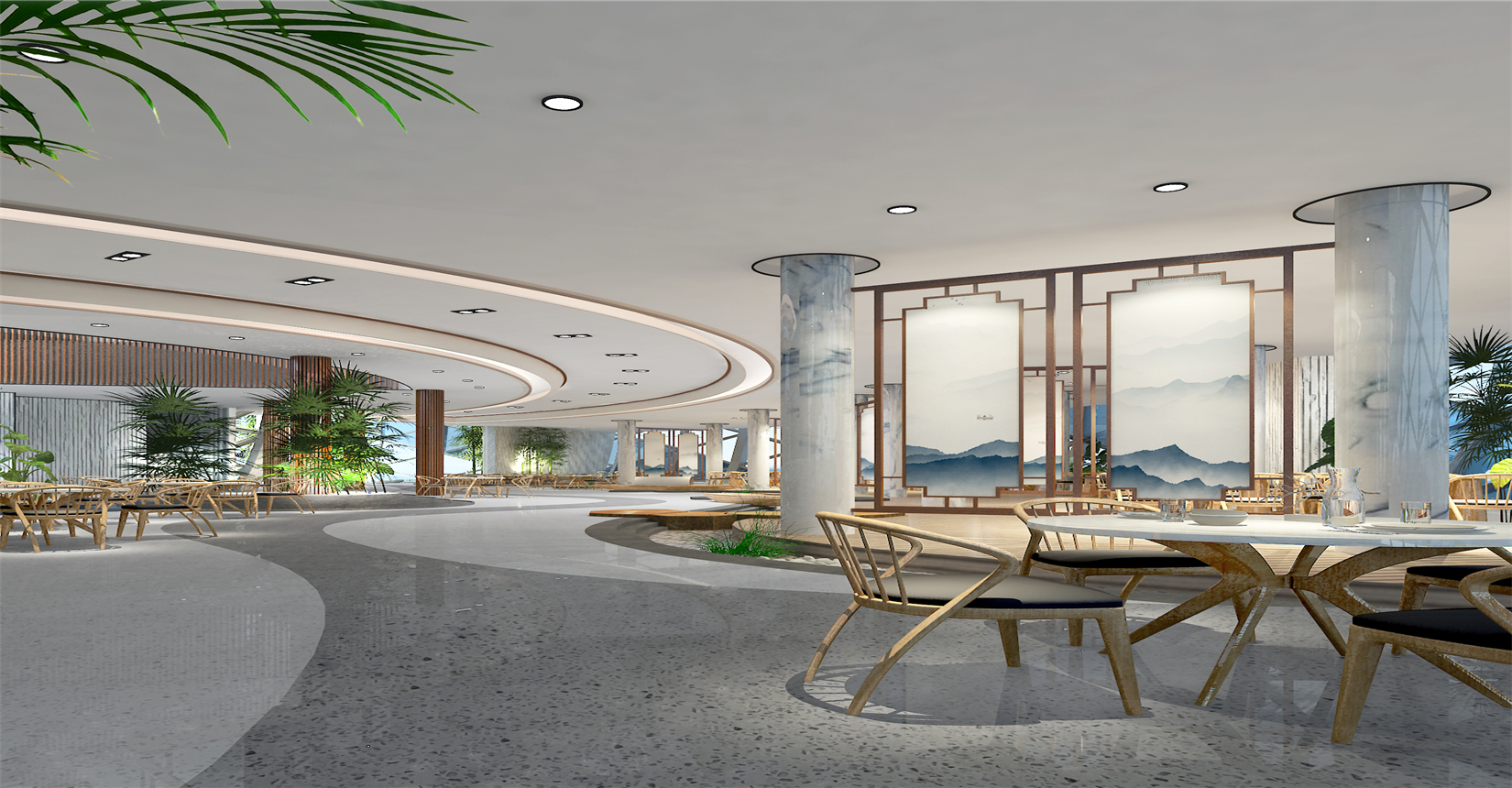 餐廳定位區(qū)別于傳統(tǒng)私人生態(tài)農(nóng)莊、農(nóng)家樂,需要更多結(jié)合智慧、科技、現(xiàn)代元素打造生態(tài)內(nèi)核,因此創(chuàng)新性地使用新東方主義設(shè)計(jì)風(fēng)格,將東方地域特色的典雅韻味植入于餐廳環(huán)境。在材料的使用上,多使用如花崗玉、裝飾纖維水泥板、仿古磚、防腐木地板等自然材料,突出餐廳的整體生態(tài)氛圍。