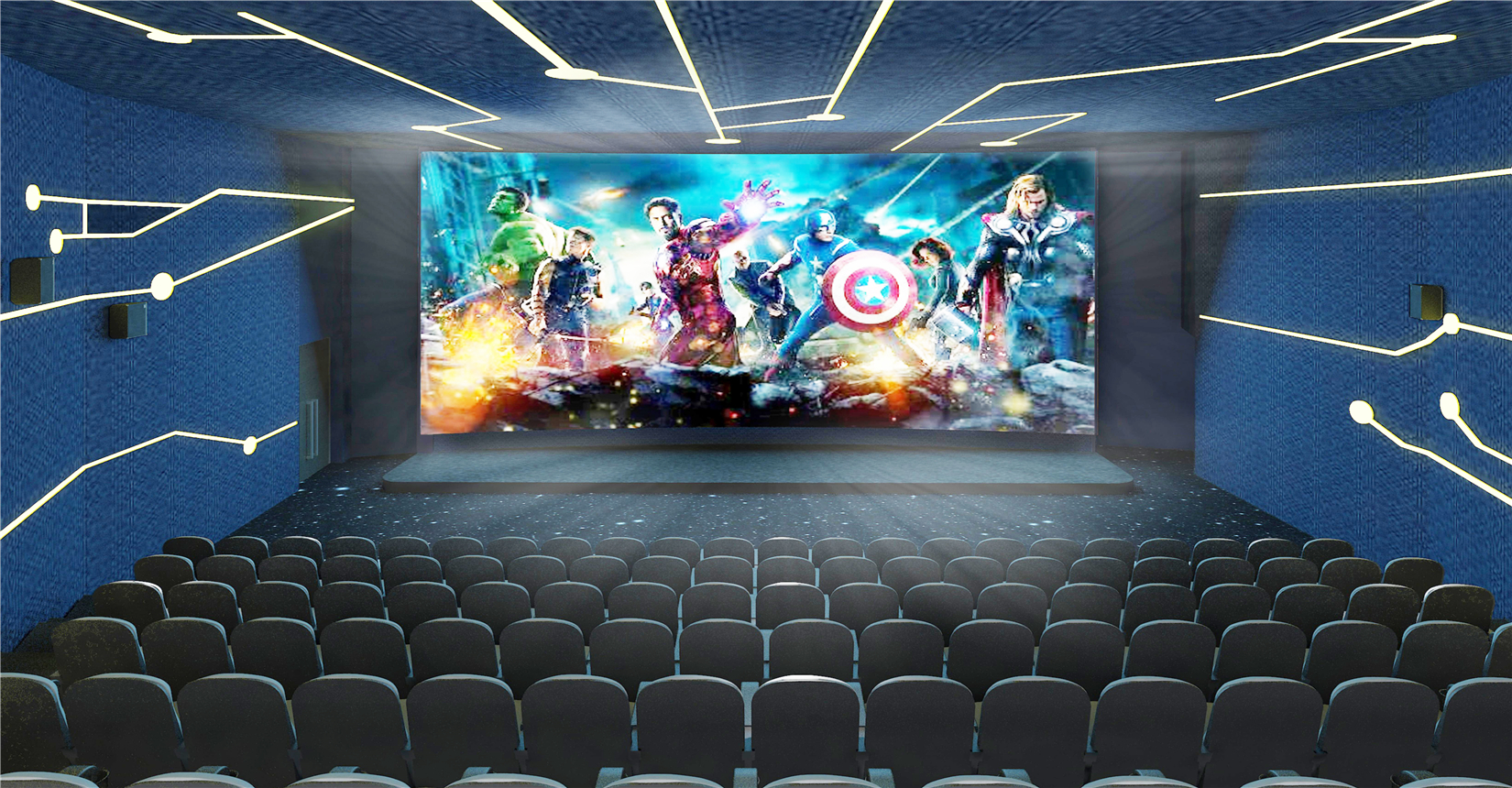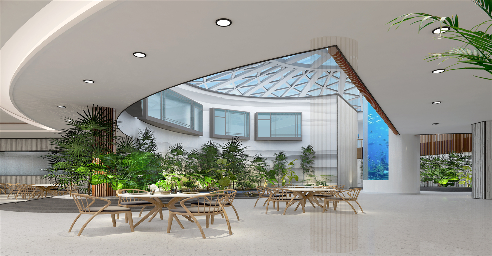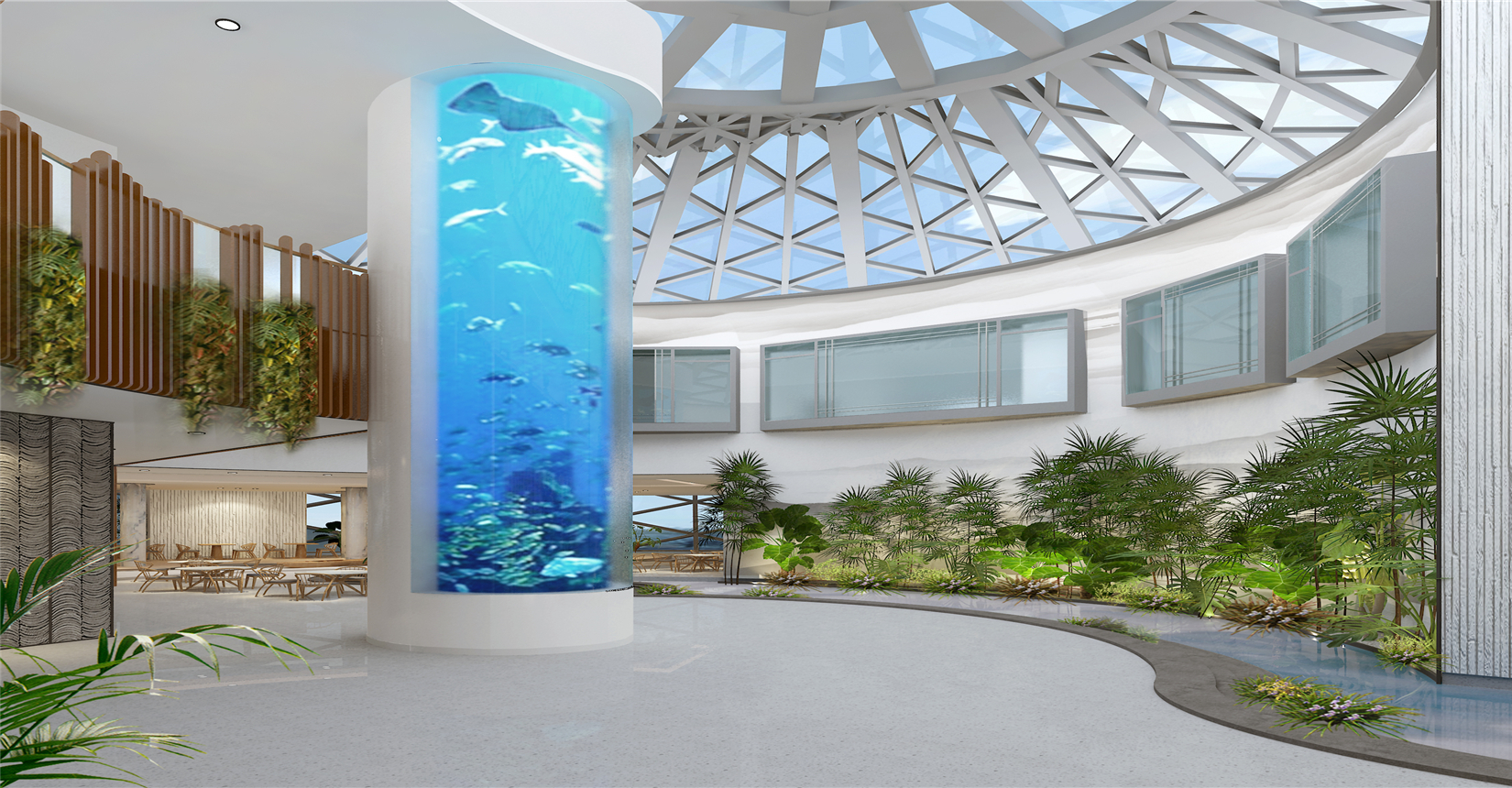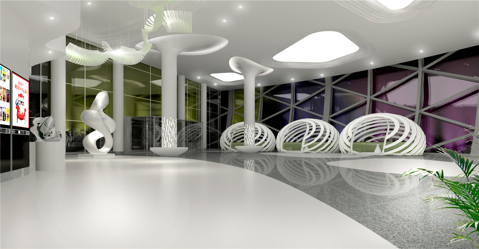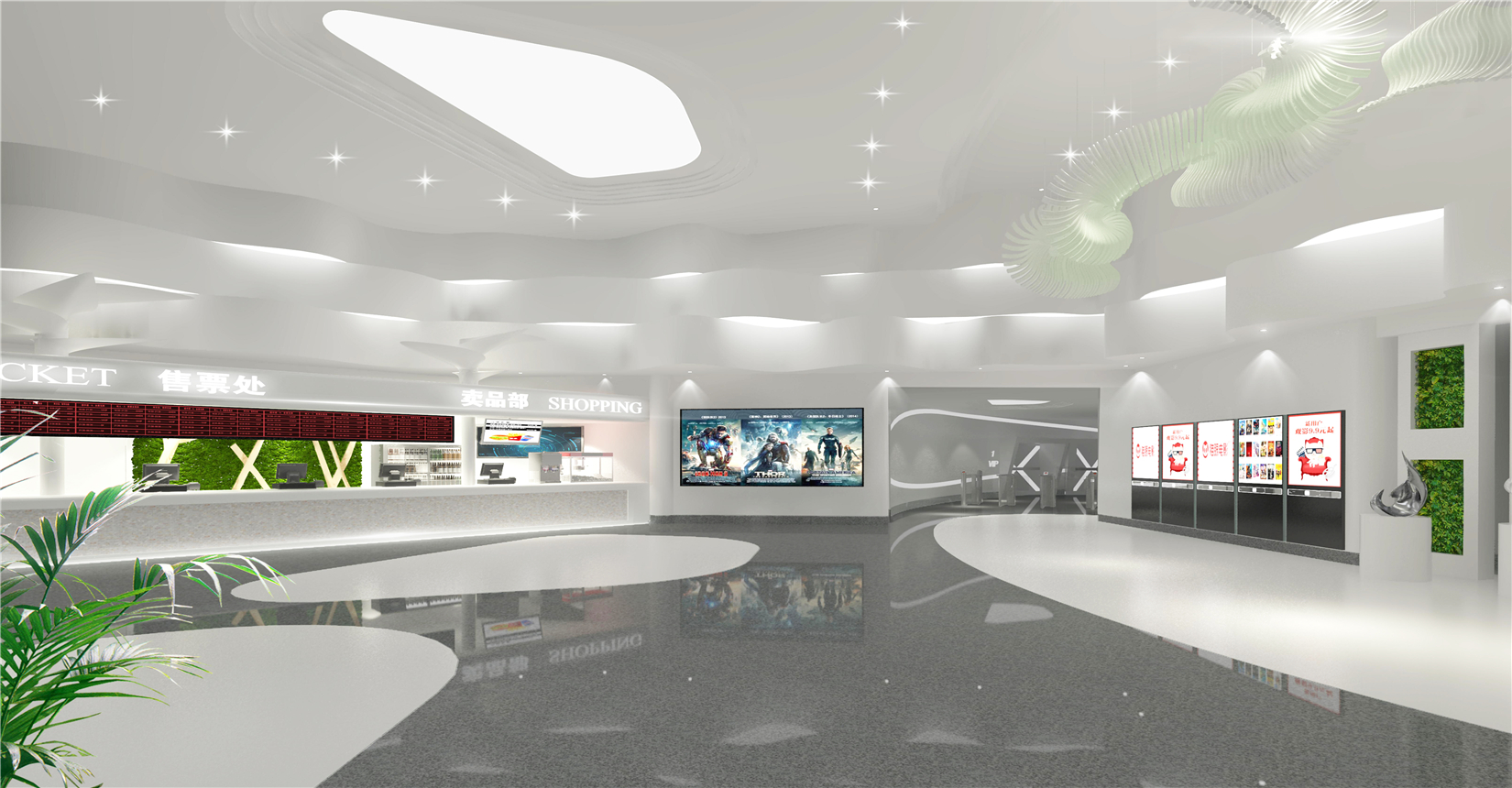 電影院在內(nèi)部空間造型設(shè)計(jì)上延續(xù)建筑外立面海螺鋼結(jié)構(gòu)美感,以連貫性曲線為特征,做到內(nèi)外形式美感相呼應(yīng)。以白色金屬板材、白色系魔石地坪及綠色植物垂直造景墻面為主材,全方面打造契合濕地文化主題的生態(tài)景觀體系影城。
