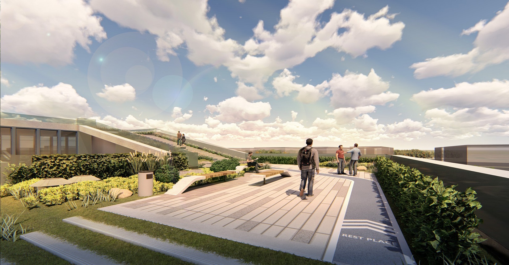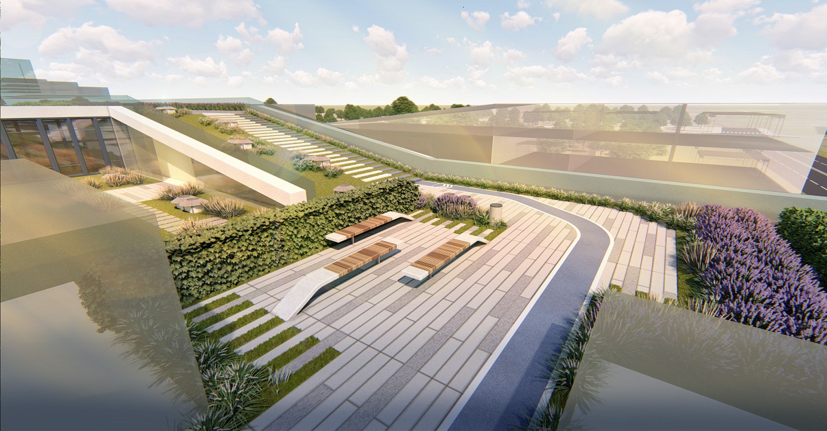 強調(diào)室內(nèi)空間和室外空間的融合,利用屋面打造慢行系統(tǒng),使建筑成為公園的組成部分,將公園景觀引入建筑當(dāng)中,打造具有標(biāo)志性的城市客廳、一個戶外生態(tài)客廳、原生態(tài)的生活空間,鼓勵面對面的交流,員工之間的交流,員工與客戶的交流,鄰里之間的交流。使用一條流動的能量線環(huán)形慢跑道,串聯(lián)整個空間傳達(dá)先進(jìn)、高能量與流動的整體形象。
